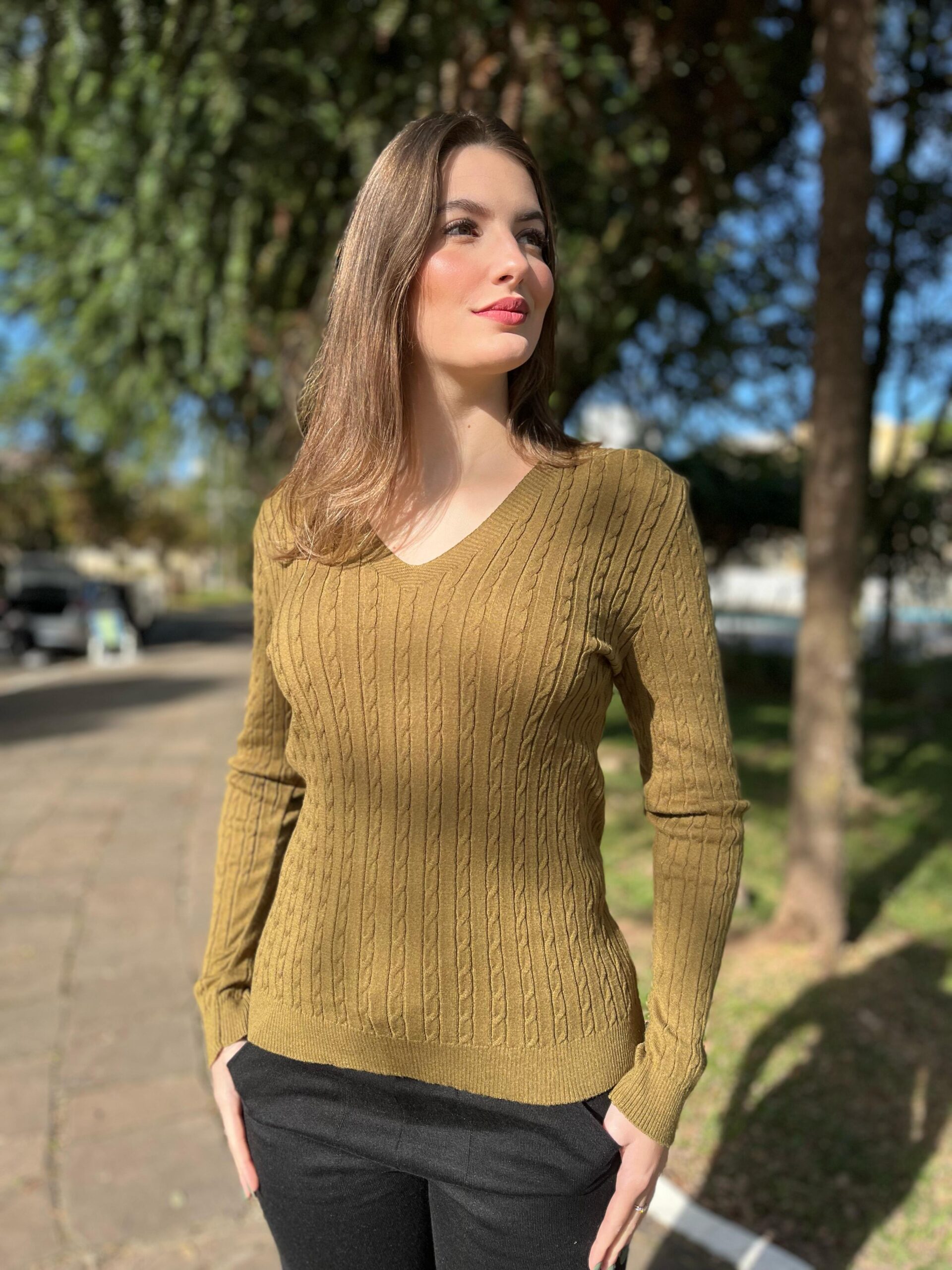 Invista em uma blusa que une qualidade, conforto e sofisticação. Garanta já a sua Blusa Ponto Trançado com Gola em V e sinta-se elegante e confiante em qualquer ocasião!